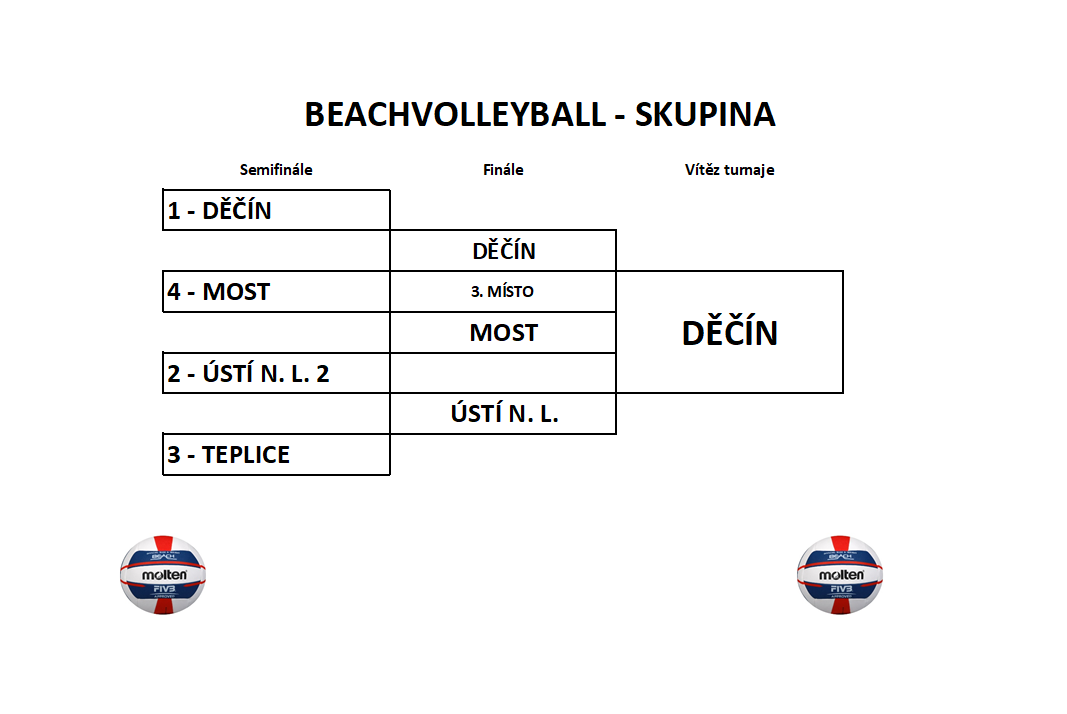 Semifinále a finále se hrálo na 2 vítězné plnohodnotné sety do 15 bodů. Bylo se opravdu na co dívat a každý z účastníků nechal na písku doslova duši. Z tabulky základního kola postoupili do semifinále 4 týmy - Děčín, Ústí nad Labem 2, Most a Teplice. Tyto 4 týmy se utkali ještě ve vyřazovací části systémem 1. vs 4. a 2. vs. 3. tým po základním kole. Pavouk tedy svedl dohromady tyto dvojice - Děčín vs. Most a Ústí nad Labem 2 vs. Teplice. Ve finále se utkali týmy Děčína a Ústí nad Labem.